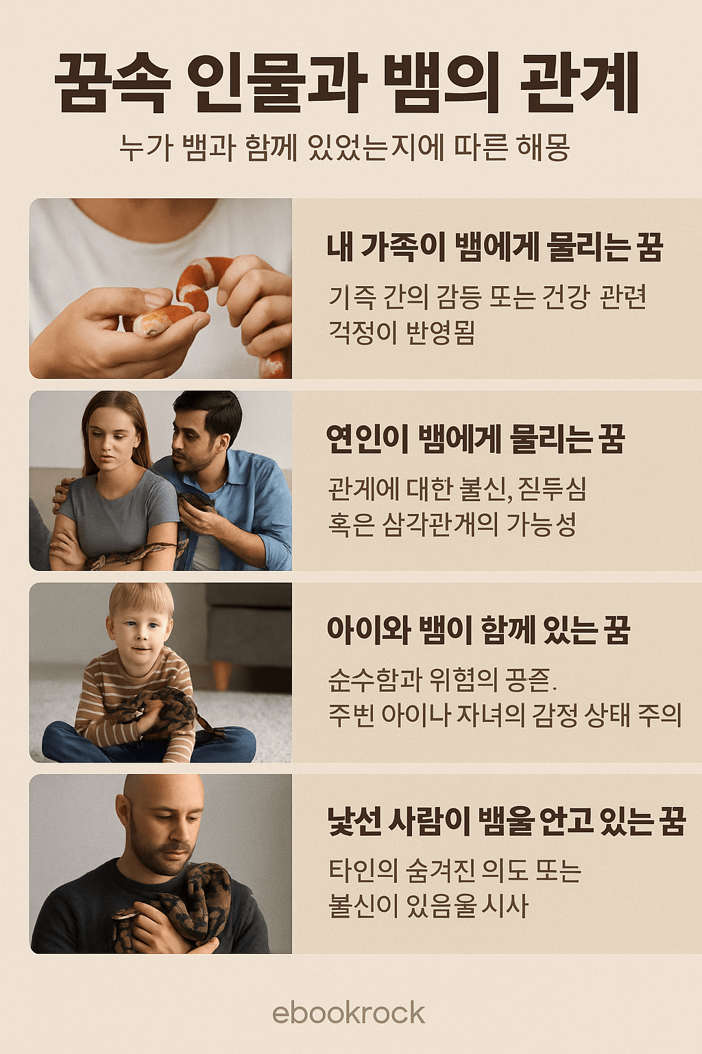 꿈에 등장한 ‘뱀’과 ‘인물’이 함께 있을 때 의미는?꿈에서 뱀이 등장하는 것만으로도 강한 인상을 주지만, 그 뱀과 함께 있는 사람이 누구냐에 따라 해몽의 방향은 완전히 달라집니다.내 가족이 뱀에게 물리는 꿈, 연인이 뱀과 얽히는 꿈, 아이와 뱀이 함께 있는 장면, 또는 낯선 사람이 뱀을 안고 있는 모습까지—이러한 꿈은 각각 심리적 갈등, 관계에 대한 불안, 보호 본능, 혹은 경계심을 드러내는 무의식의 메시지일 수 있습니다.이번 포스팅에서는 뱀과 인물이 함께 등장한 꿈의 유형별 의미를 자세히 해석해 드립니다. 1. 내 가족이 뱀에게 물리는 꿈: 가족 간의 갈등 또는 건강에 대한 걱정을 반영하는 꿈꿈속에서 가족이 뱀에게 물리는 장면을 본다면, 그 자체로 매우 불안한 느낌을 줍니다.이런 꿈은 현실에서 가족 ..